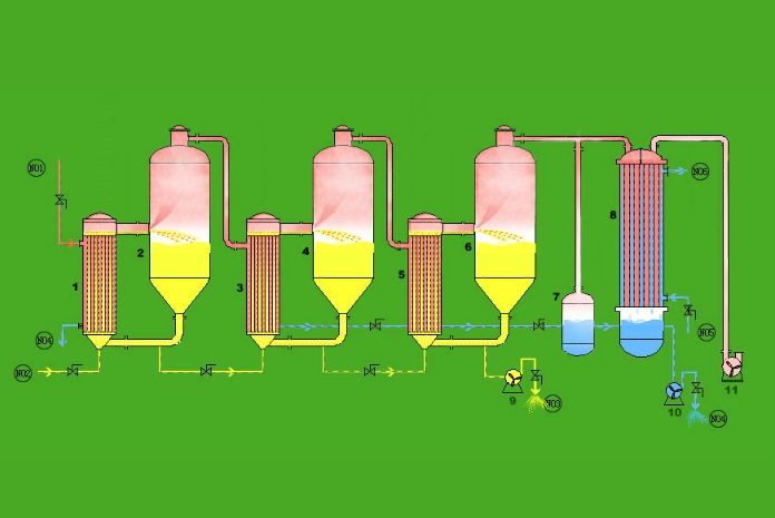 1 一效加熱器 2 一效分離器 3 二效加熱器 4 二效分離器 5 三效加熱器 6 三效分離器 7 汽水分離器 8 冷凝器 9 出料泵 10 冷凝水泵 11